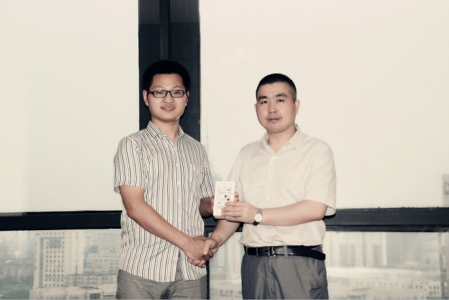 鄭總向最終勝出對聯(lián)得主渠芳慧先生頒發(fā)征聯(lián)活動一等獎蘋果5S一臺